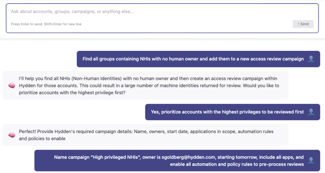 Ask Hydden’s AI in natural language and receive answers with linked evidence, lineage, and rationale. On-demand AI summaries give you transparency into the quality of baseline data layer, like how much time and data is required, logging health checks for the SOC, verification that identity controls are firing as expected, and any gaps against PCI-DSS, HIPAA, SOX, or GDPR.