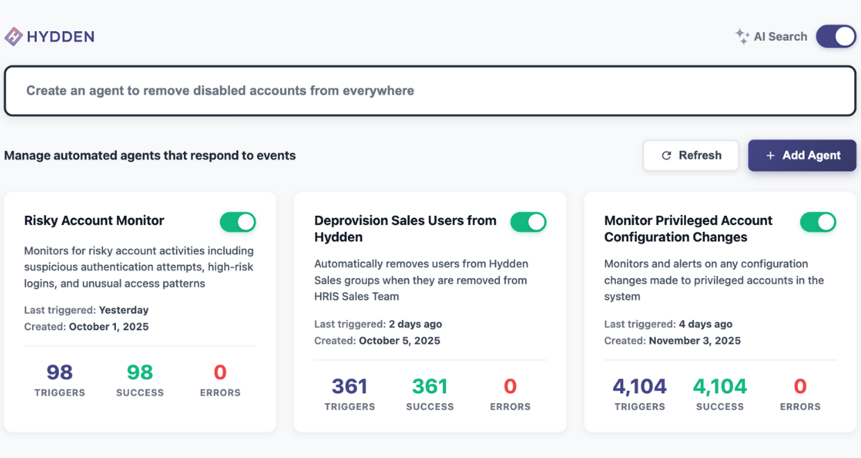 Turn insights into confident action. Create both AI and deterministic agents to watch specific conditions (like “alert me when an machine account is created and added to a group”) or to act with approvals (like “remove the account now and next time it happens”). With our agents, you can observe and respond the way you want, without tool or scope limitations.