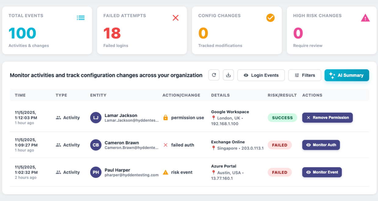 Observability layers event-driven telemetry that captures critical events. Monitor runtime activity across apps, devices, and directories like group membership changes, role and entitlement modifications, and privilege escalations. Observability correlates changes back to your baseline discovery data so conclusions reflect reality, not stale snapshots. That clean baseline is why our findings outperform traditional ITDR fed by incomplete data.